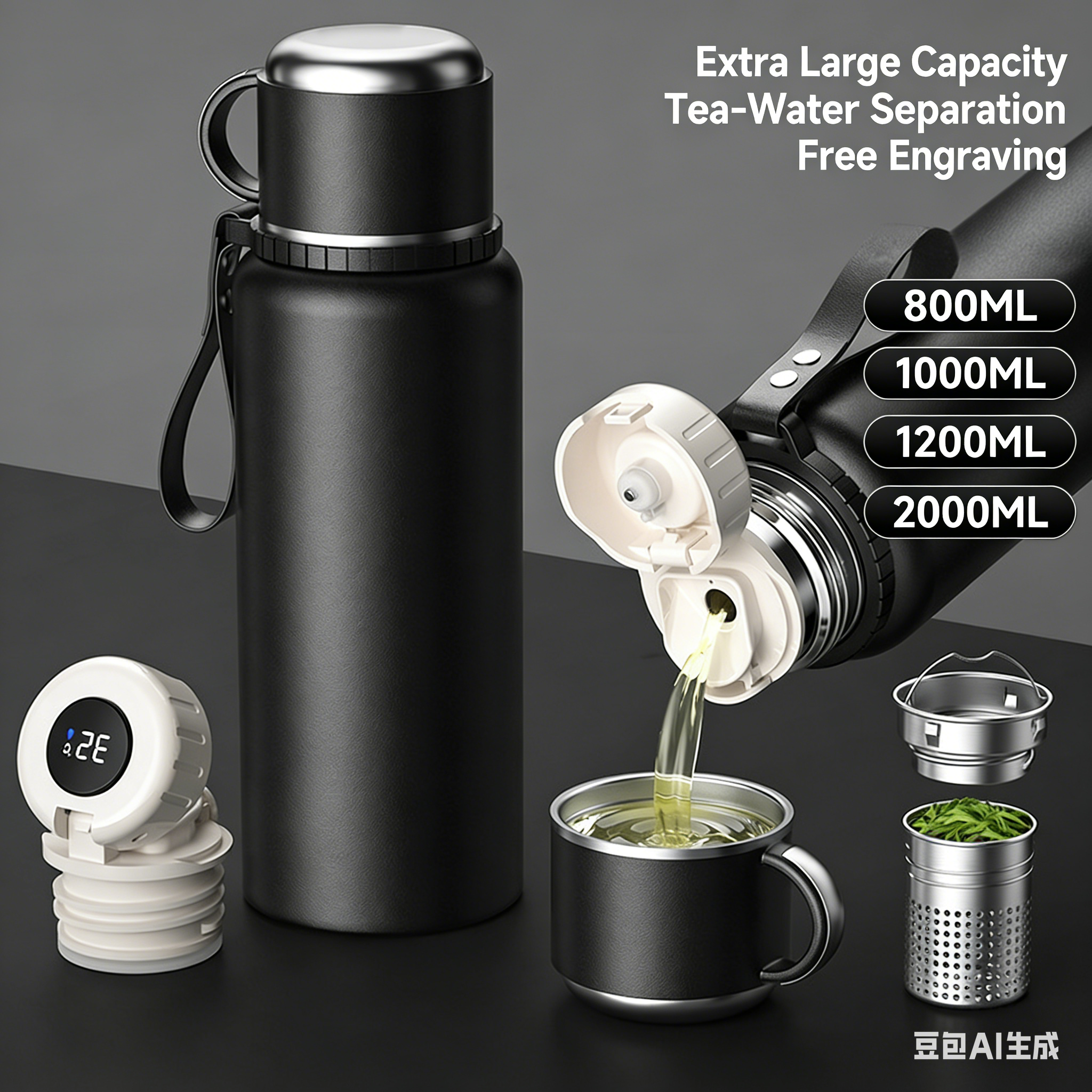 Men’s Stylish High-Capacity Insulated Tea Kettle with Temperature Indicator 316 Stainless Steel Thermal Mug with Tea-Water Separation Gift-Worthy Water Kettle